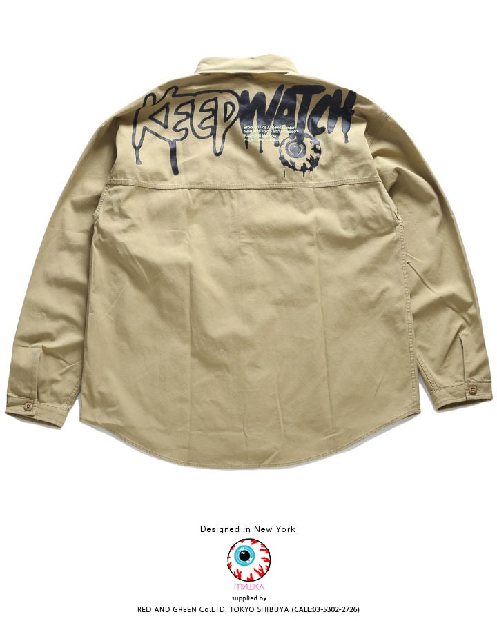 • MISHKA 長袖シャツ メンズ レディース 春秋冬用 カーキ M-XL 大きいサイズ ミシカ カバーオール かっこいい おしゃれ スプレープリント KEEPWATCH 目玉 人気キャラクター ビッグシルエット ヒップホップ ストリート系 ハイ 服M21000211