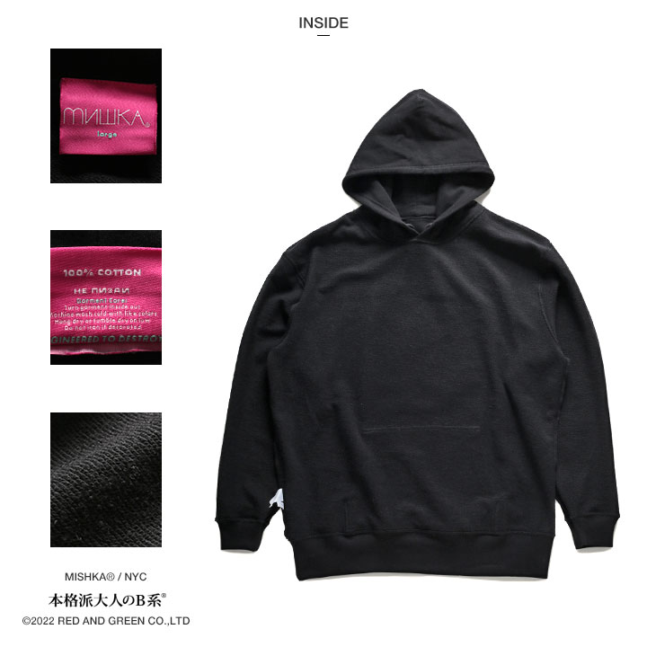 B系、ストリートファッションを牽引するMISHKAアメリカ企画なので、品質もディティールも安心の仕上がり。大きいサイズでルーズに着こなすスタイルはもちろん、タイトやジャストサイズのカジュアルにもしっかりハマります。男性はもちろん、女性にもオススメ。