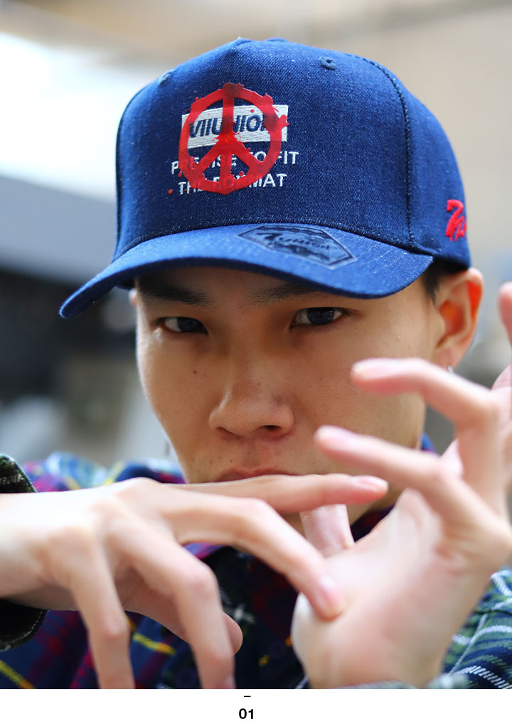 7UNIONコレクターなら絶対欲しい「刺繍×プリント」ロゴキャップ。フロントパネルセンターにブランドBOXロゴとテキスト刺繍を施し、その上から平和の象徴であるピースマークを刺繍が見えるようにプリントした高度なデザイン。
