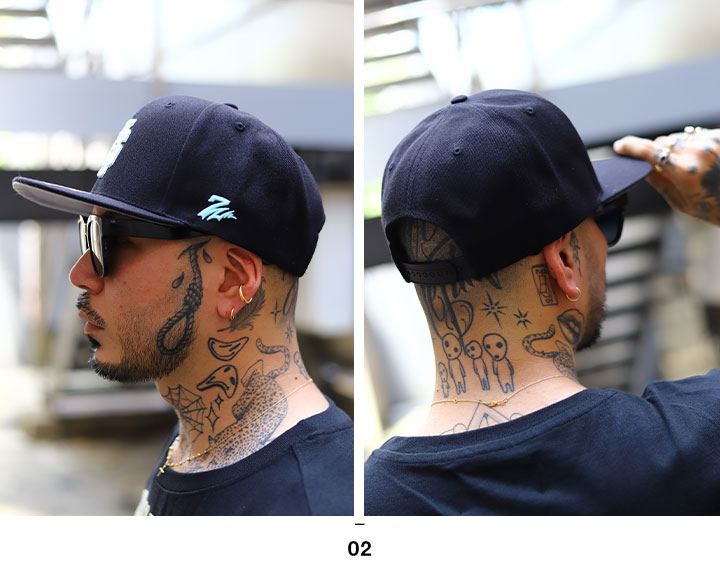 「スナップバックキャップ」や「ベースボールキャップ」とも呼ばれる高めのクラウンと四角型フラットバイザーによる、スポーティーなシルエット。