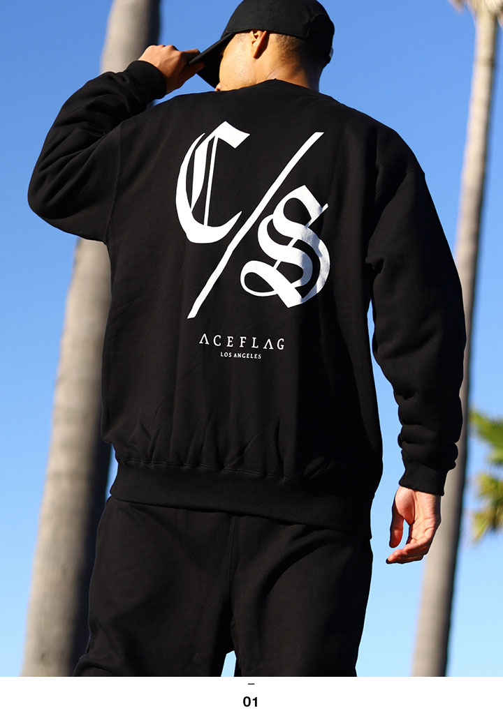 背中に、神のご加護を意味する「C/Sロゴ」をドロップしたトレーナーと筆記体の「Gang」をドロップしたスウェットロングパンツの上下セット。