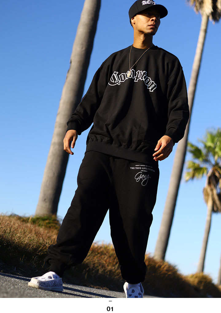 N.W.A.を輩出し、Straight Outta Comptonの舞台としても知られている「Compton」をドロップしたトレーナーと筆記体の「Gang」をドロップしたスウェットロングパンツの上下セット。