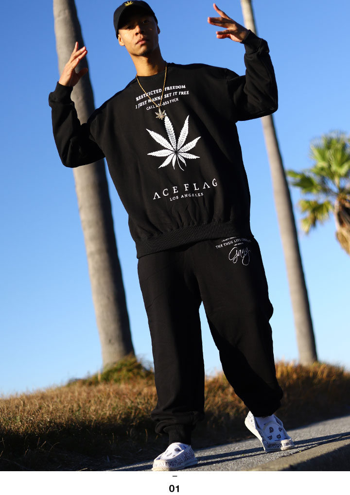 胸元に「マリファナ」をドロップしたトレーナーと筆記体の「Gang」をドロップしたスウェットロングパンツの上下セット。