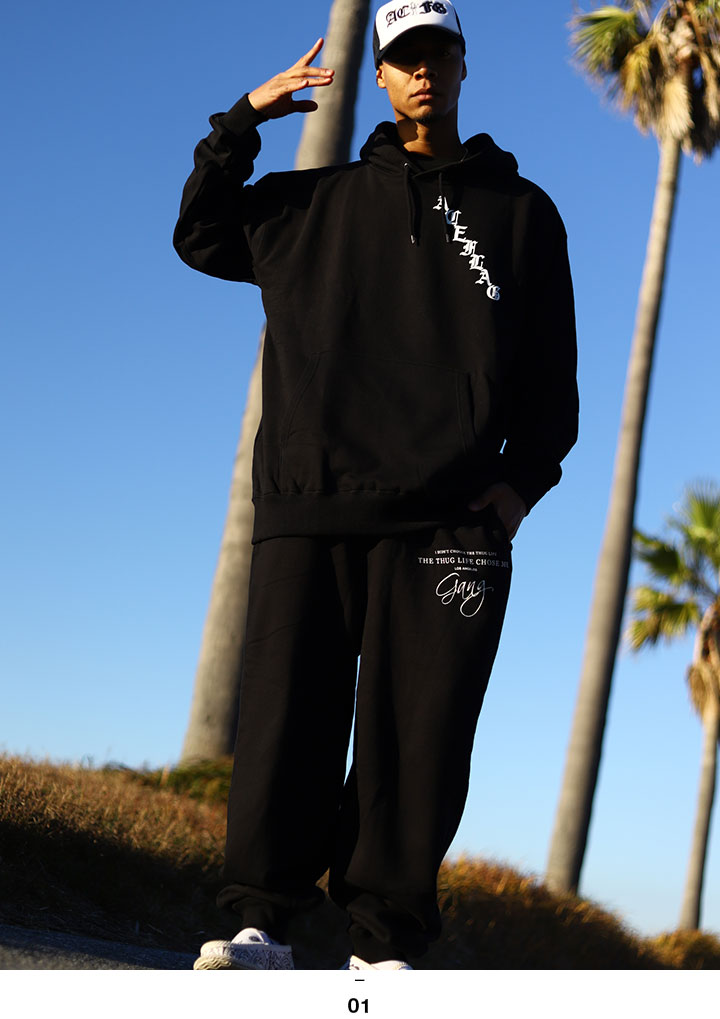 背中に、神のご加護を意味する「C/Sロゴ」をドロップしたパーカーと筆記体の「Gang」をドロップしたスウェットロングパンツの上下セット。