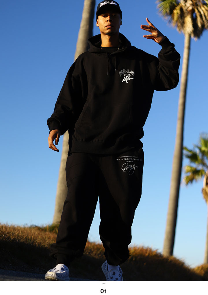 ウエッサイを代表する伝説的ラップ・アーティストの「タトゥー」をドロップしたパーカーと筆記体の「Gang」をドロップしたスウェットロングパンツの上下セット。