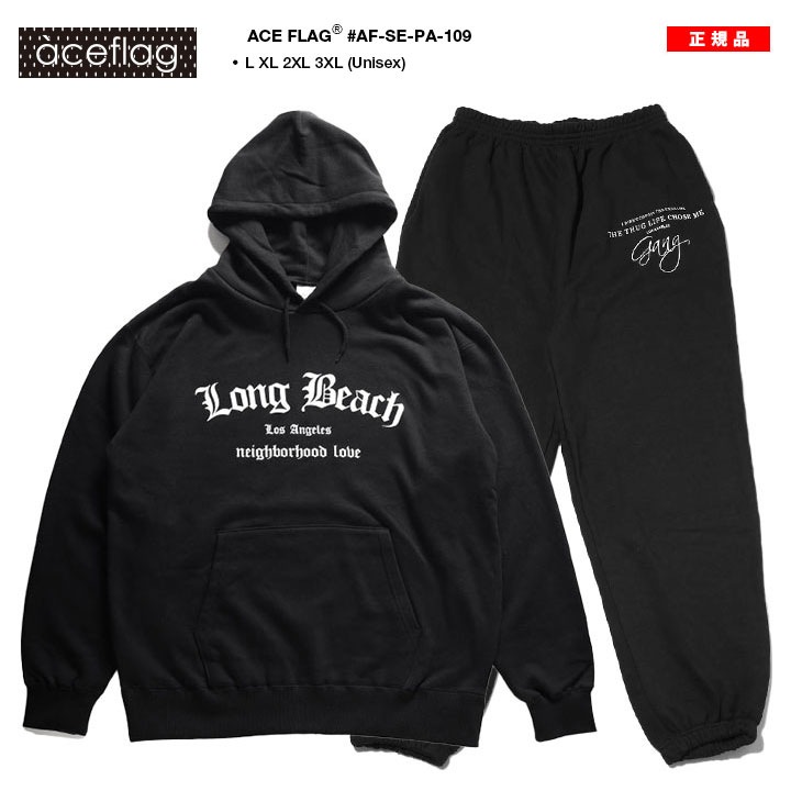 LBCの 略称で馴染み深い「Long Beach」をドロップしたパーカーと筆記体の「Gang」をドロップしたスウェットロングパンツの上下セット。