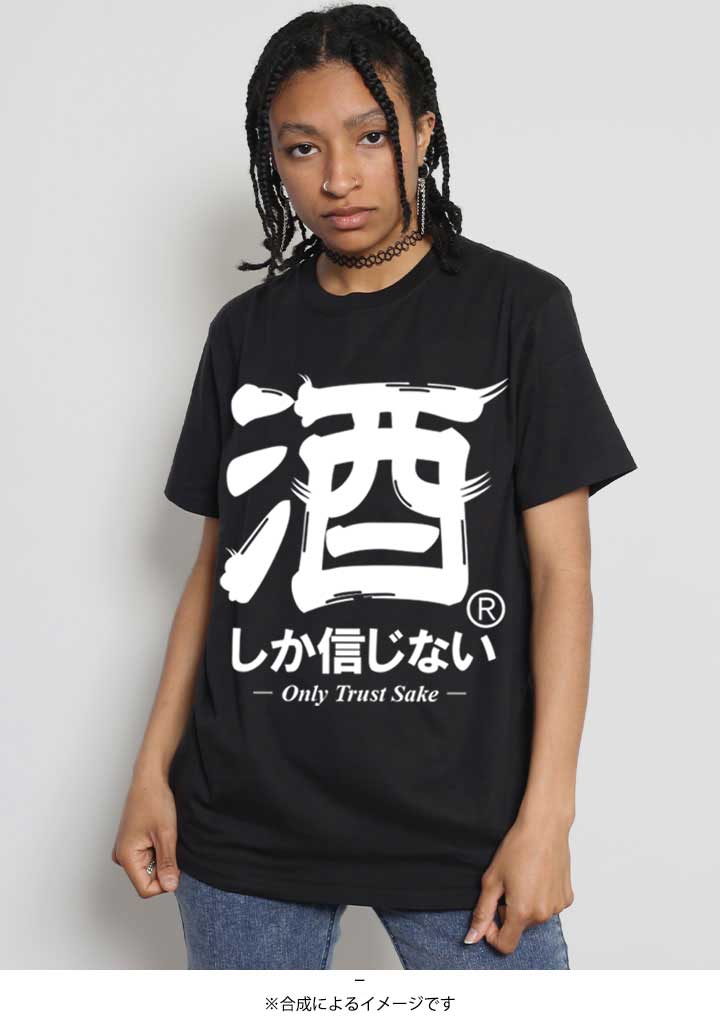ブランドロゴの「酒しか信じない®」をドロップした半袖Tシャツ。