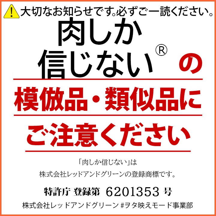 「肉しか信じない 」は株式会社レッドアンドグリーンの登録商標です。模倣品・類似品にご注意ください。