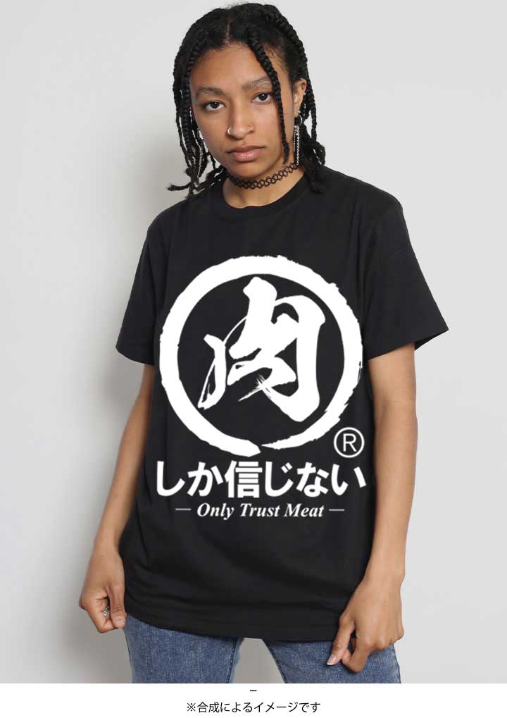 ブランドロゴの「肉しか信じない®」をドロップした半袖Tシャツ。