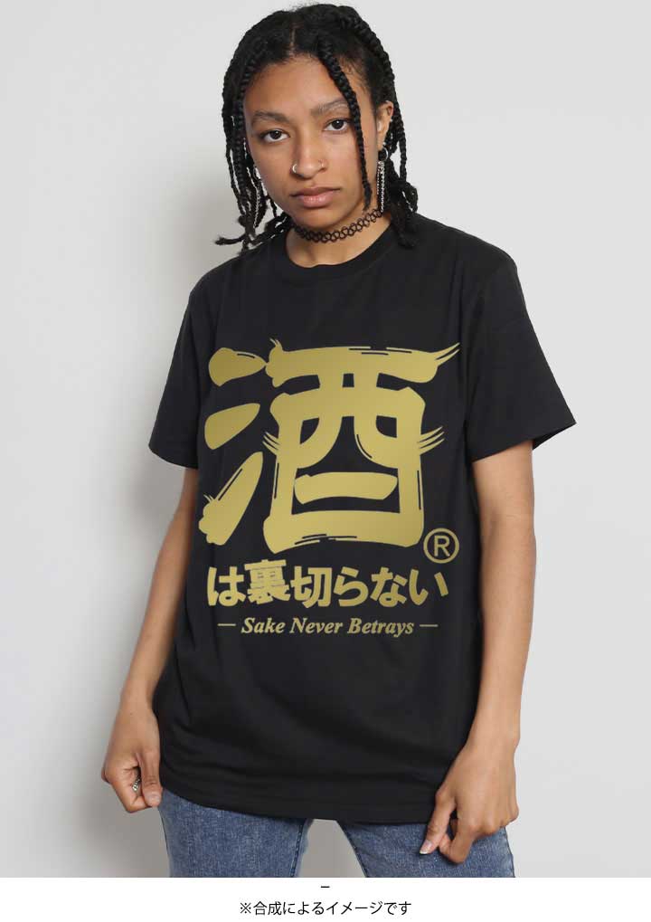 ブランドロゴの「酒は裏切らない®」を金プリントでドロップした半袖Tシャツ。